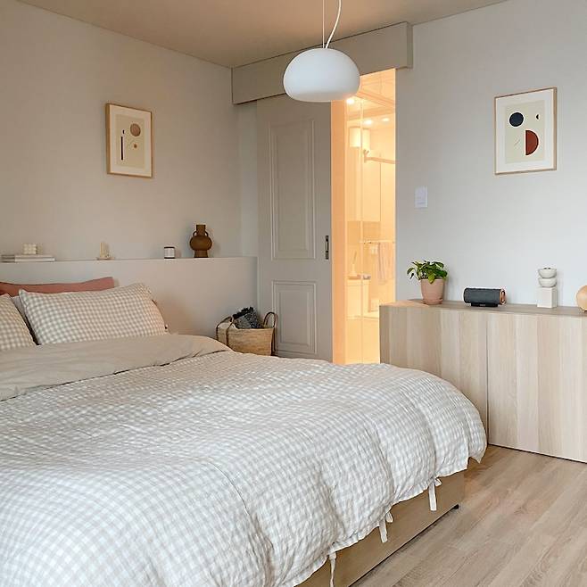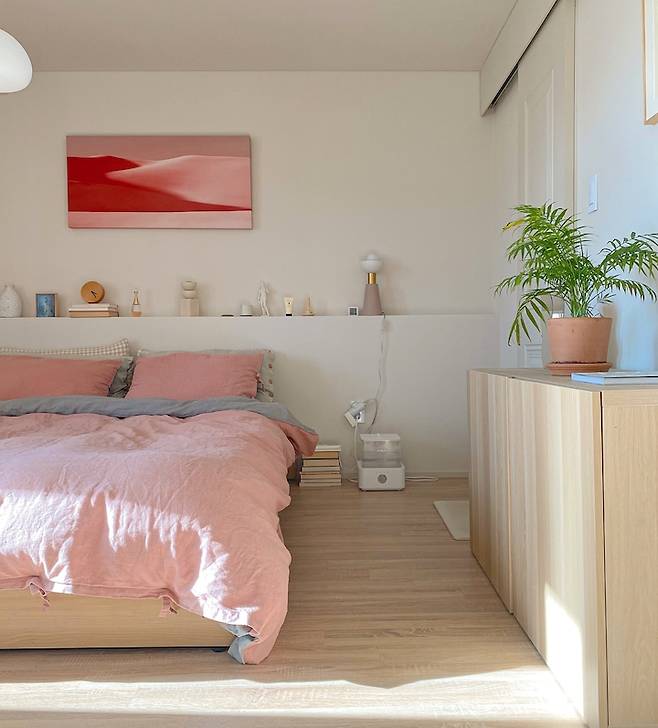침대 프레임은 헤드가 없는 심플한 타입으로 선택했어요. 침대 위에서 책을 보거나 차를 마실 때 침대 협탁으로는 공간이 애매하게 부족할 때가 있더라고요. 그래서 헤드가 없는 타입을 고르는 대신 뒷벽에 선반을 만들어서 자주 사용하는 침실용 소품들을 올려두고 지내고 있습니다.