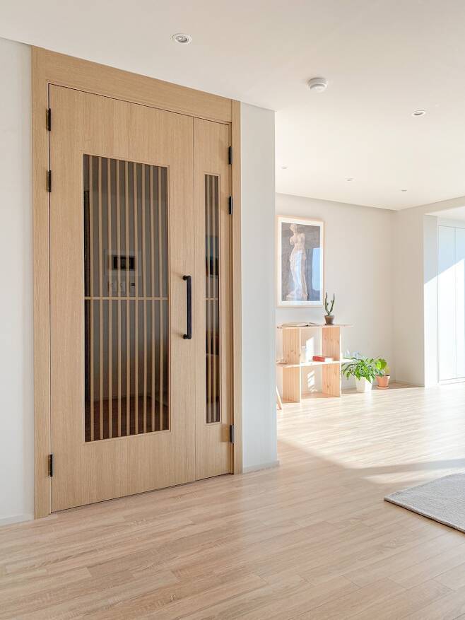 중문은 깔끔한 우드로 제작하고, 안이 훤히 들여다보이지 않도록 나무 창살을 넣었어요. 현관은 좋은 기운이 드나드는 통로 역할을 하기 때문에, 늘 깨끗하고 깔끔하게 유지를 하는 게 좋다고 해요. 그래서 신발장과 우산장을 설치했고, 바닥은 띄워서 간접조명으로 센서 등을 같이 넣었어요.