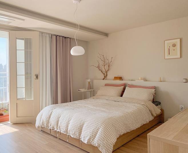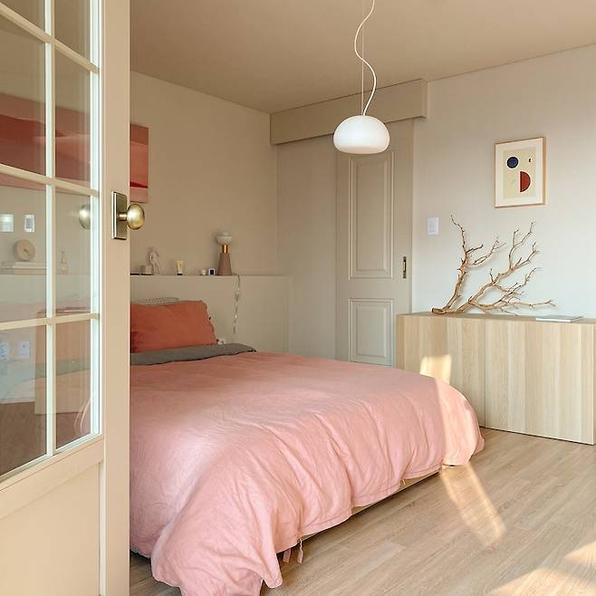 침실은 공사할 때 가장 신경 쓴 부분 중 하나예요. 특히 침실의 발코니 도어는 예전부터 꼭 해보고 싶었던 부분이거든요. 격자형 창살이 들어간 도어를 언젠가 꼭 해보고 싶었는데, 이번 집에서 어느 방에 넣을지 후보지를 정해보다가 거실처럼 빛이 풍부하게 들어오는 침실을 보고 고민하지 않고 바로 여기구나 싶었습니다.