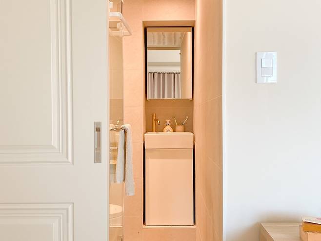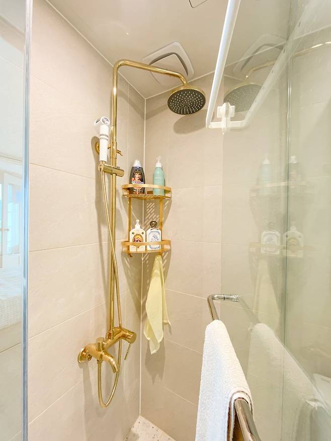 세면대와 변기만 있던 곳에 샤워부스를 같이 넣었고, 기존에 잘 안 해봤던 골드 컬러를 사용했던 점 그리고 곳곳에 수납장을 짜서 수납까지 신경 쓴 곳이라 애정이 많습니다. 그리고 유일하게 슬라이딩 도어를 사용한 곳이기도 해요.