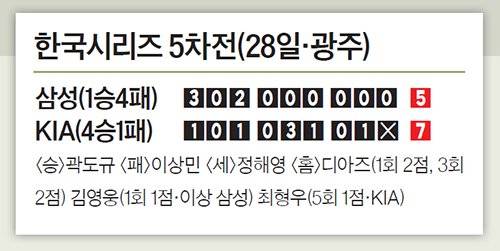 삼성도 마지막까지 최선을 다했다. 특히 삼성 외국인 타자 르윈 디아즈는 1회 초와 3회 초 연속으로 2점 홈런을 터트려 KIA 에이스 양현종(2와 3분의 2이닝 5실점)을 무너트렸다. 지난 15일 LG 트윈스와의 플레이오프 2차전에 이어 또다시 연타석 아치를 그려 역대 최초로 단일 포스트시즌에서 두 차례 연타석 홈런을 기록한 타자가 됐다. 또 올가을 홈런 수를 5개로 늘려 류중일(1991년) 이승엽(1999년·이상 4개) 등 내로라하는 타자들을 넘어 역대 삼성 선수 단일 포스트시즌 최다 홈런 기록을 썼다.