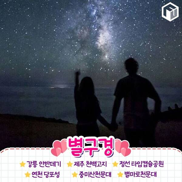 밤에만 즐길 수 있는 심야 데이트 코스, '별 구경'입니다. 번쩍이는 네온사인이 가득한 도심의 빛 공해에서 조금만 벗어나도 밤하늘을 빼곡히 채운 별 구경을 쉽게 할 수 있는데요. 유난히 별이 많이 관측되는 별 명소도 함께 추천합니다.
