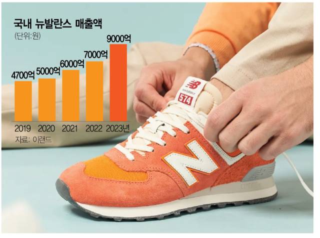 한국 시장에서 뉴발란스는 ‘연매출 1조 원’ 고지를 눈앞에 뒀다. 지난 2008년 이랜드와 독점 유통 계약을 맺기 전까지는 국내에서 연 250억 원 규모의 매출을 올리는 중소형 스포츠 브랜드에 불과했다. 하지만 계약 이후 2020년의 연간 판매가 5000억 원을 돌파하더니 지난해는 연매출 9000억 원 규모로 성장했다. 이랜드 관계자는 “한국 뉴발란스 전체 매출에서 신발의 비중은 절반 이상을 차지할 정도로 중요도가 높다”며 “브랜드 철학을 담은 상품을 지속 선보이겠다”고 했다.