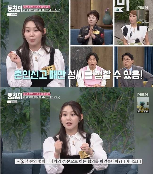 검사인 남편은 자신이 법 공부를 해보니 남녀가 정당한 이유 없이 다른 대우를 받는 건 차별이며, 부성을 따를 때 얻을 수 있는 사회적 이익과 모성을 따를 때 얻을 수 있는 사회적 이익이 차이가 없으면 성씨도 선택할 수 있는 건데 당연히 부성이 먼저인 게 문제라며 자신의 의견을 전했다고 합니다.