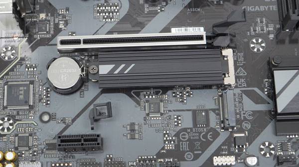 기가바이트 B650M K 제이씨현 메인보드의 확장슬롯, PCIe 4.0 x16 슬롯과 PCIe 3.0 x1슬롯 가운데에는 2개의 M.2 소켓을 확인할 수 있다. 윗쪽 M.2 소켓은 방열판이 기본 제공되며, 하단 M.2 소켓은 방열판이 제공되지 않는 대신 최대 22110 규격의 SSD를 장착할 수 있다.