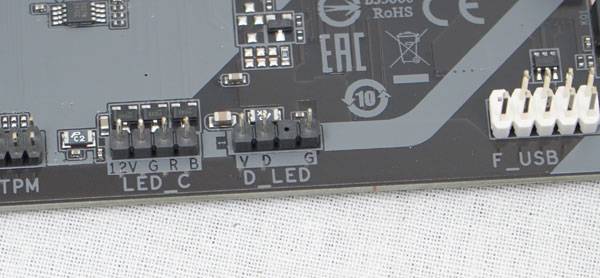 메인보드 자체에는 별도로 튜닝용 LED 칩이 사용되지 않았지만, (A)RGB LED 튜닝을 즐기는 사용자를 위해 메인보드 하단에 5V ARGB LED와 12V RGB LED 장치 연결을 위한 헤더를 하나씩 배치해 놨다.