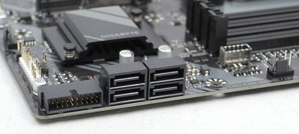 기가바이트 B650M K 제이씨현 메인보드의 SATA 포트는 일반적인 메인스트림급 B650 칩셋 메인보드의 구성인 4개를 갖췄으며, SATA 포트를 기준으로 좌측에는 USB 3.0 Type-A 용 헤더, 우측에는 USB 3.0 Type-C 소켓용 헤더를 갖췄다.