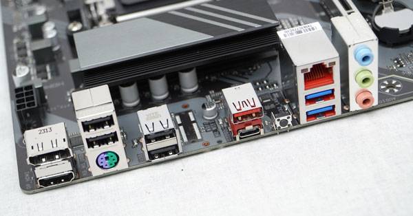 백패널의 I/O 포트는 총 여덟 개의 USB 포트(검은색 USB 2.0 x4/ 파란색 USB 3.0 x2/ 붉은색 USB 3.1 x2), CPU 내장 그래픽을 위한 DP 포트와 HDMI 포트(각 4K 60Hz 지원), PS/2 콤보 포트, 리얼텍 RTL8125BG 컨트롤러 기반 2.5Gbps 이더넷, 리얼텍 ALC897 7.1채널 HD 오디오 코덱 지원 오디오 포트로 구성되어 있다.