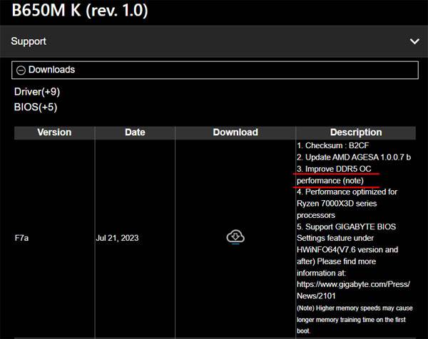 기가바이트 B650M K 제이씨현 메인보드의 DDR5 메모리 슬롯 4개는 F4 바이오스부터 고밀도 모듈(48GB / 24GB)를 지원해 총 192GB까지 확장할 수 있다. 오버 클럭도 공식적으로 DDR5 6400MHz까지 지원하며, 7월 21일자로 메모리 오버클럭 성능과 게이머를 위한 라이젠 7000X3D 시리즈 성능을 최적화한 AGESA 1.0.0.7b 코드 기반 F7a 버전 바이오스가 배포 중이다.
