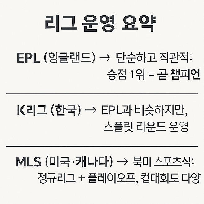 MLS (미국·캐나다) → 북미 스포츠식: 정규리그 + 플레이오프, 컵대회도 다양