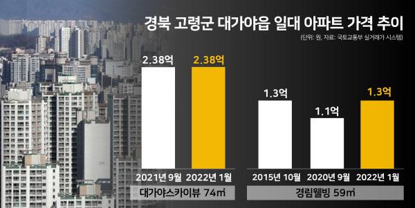 고령군 집값도 요지부동이다. 지난 4년여 동안 전국 부동산 가격이 폭등 수준으로 올랐지만, 이 일대 아파트 가격은 거의 오르지 않았다. 고령군 대가야읍 ‘리치캐슬’ 31평이 2017년 9월 1억7350만원에서 올해 2월 1억9500만원으로 소폭 오르는데 그쳤다. ‘대가야스카이뷰201’ 29평은 지난해 9월 2억3800만원에서 올해 1월 2억3800만원으로 집값이 제자리 걸음이다. 심지어 ‘경림웰빙’ 25평은 2015년 10월 1억3000만원에서 2020년 9월 1억1000만원으로 되레 떨어졌다가, 올해 1월 1억3000만원으로 7년 전 집값을 겨우 회복했다.