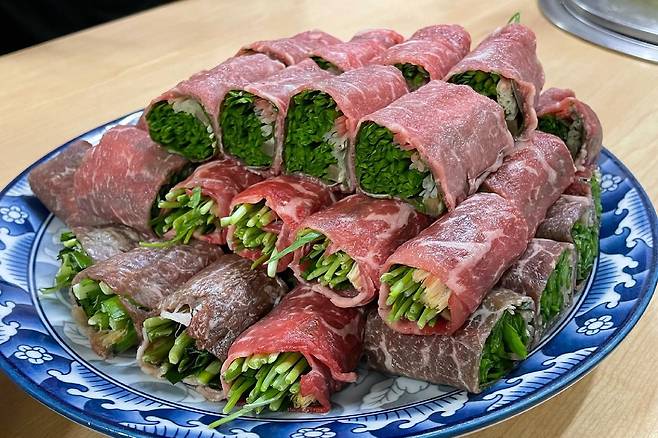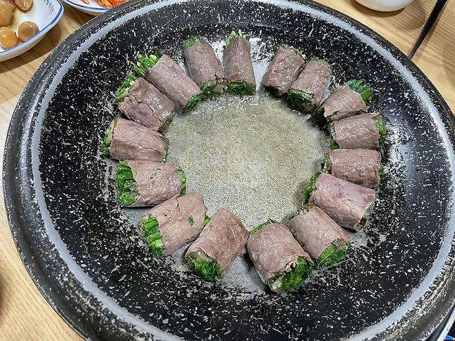 원주 현지인들에게 한우고기말이로 인기가 많은 집. 얇게 저민 한우에 쪽파를 넣어 김밥처럼 돌돌 말아 구워 먹는 이색적인 맛의 한우고기말이를 맛볼 수 있다. 오목한 철판에 기름을 살짝 두른 뒤 굴려가며 익힌 후 과일에 겨자를 첨가해 만든 주황색 소스를 찍어 즐기면 된다. 한우의 녹진한 풍미와 쪽파의 아삭하고 개운한 맛이 어우러져 제대로 된 별미를 즐기게 된다. 깻잎장아찌에 잘 익은 고기말이와 양배추 김치를 넣고 싸먹으면 그야말로 ‘엄지 척’을 부르는 맛. 고기 육즙이 남은 팬에 청국장이 가득 들어있는 걸쭉한 된장찌개를 넣어 든든하게 마무리할 수 있다. 이곳의 모든 식재료는 직접 농사를 지어 공수해 믿고 먹을 수 있다.