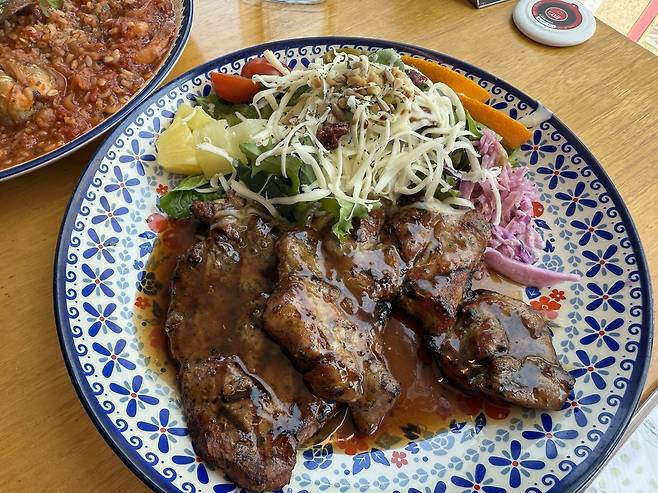 • 두툼한 수비드 목살 스테이크가 노릇노릇하게 구워져겉은 바삭, 속은 촉촉하게 씹는 맛이 훌륭해요.
