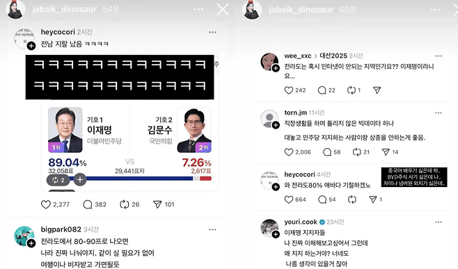 논란이 커지자 일부 네티즌들은 “일베냐”, “전라도 왜 비하하냐”는 댓글을 달았고, 잡식공룡은 이에 “(전)라도인임? 긁혔나보네”라고 대댓글을 달아 사태를 더욱 키웠습니다. 지역 감정을 자극하는 언행은 단순한 정치적 입장을 넘어 혐오 발언으로 인식되며 대중의 분노를 불렀습니다.