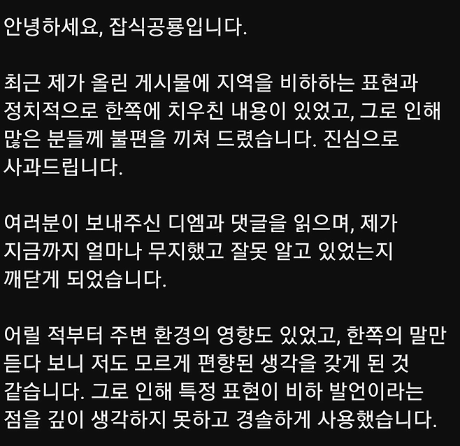 논란이 확산되자 잡식공룡은 결국 6월 6일 오후 유튜브 채널 커뮤니티를 통해 공식 사과문을 올렸습니다. 그는 “경솔하게 사용한 특정 표현이 비하 발언이 될 수 있다는 사실을 깊이 인식하지 못했다”며, “어릴 적 주변 환경의 영향을 받아 편향된 시각을 가졌던 것 같다”고 해명했습니다.