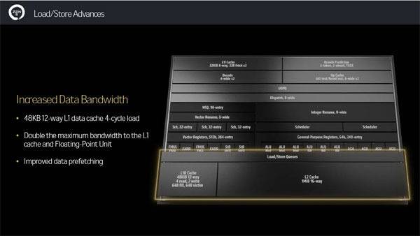 데이터 대역폭 향상을 위해 32KB 데이터 캐시를 48KB로 늘리고, 12way 4사이클 로드 동작과 L1 대역폭과 부동 소수점 유닛 대역폭을 최대 두 배로 높였다. 여기에 데이터 프리패칭 개선, 256bit 패스 2개 활용이 아닌 완전한 512bit 패스를 사용해 AVX-512 성능을 향상 시키며, 2사이클 레이턴스 FADD의 파이프라인 6개와 더 큰 부동 소수점 명령 처리를 도입했다.