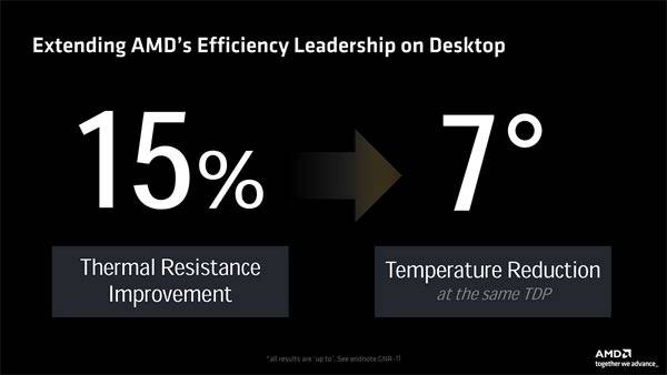 라이젠 9000 시리즈와 라이젠 AI 300 시리즈에 적용된 Zen5 아키텍처는 전성비 및 IPC 개선에 더해 TSMC 4nm 및 3nm 공정을 바탕으로 생산되며, 소형 고속 저전력 트랜지스터 사용덕에 발열 특성도 개선되었다. 열저항 성능이 15% 개선되어 동일 TDP에서 7℃ 낮은 온도를 유지할 수 있다.
