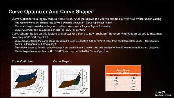 자동 오버클럭 기능인 PBO와 전력 최적화 기술인 커브 옵티마이저에 더해, 새롭게 커브 세이퍼(Curve Shaper) 기능도 추가된다. 커브 세이퍼는 3가지 온도와 5가지 속도가 조합된 총 열 다섯 가지 시나리오에 맞춰 커브 옵티마이저보다 더욱 세밀하게 안정적으로 전압을 조정하는 기능으로, 이를 통해 보다 안정적으로 더 높은 수준의 오버클럭을 노려볼 수 있다.