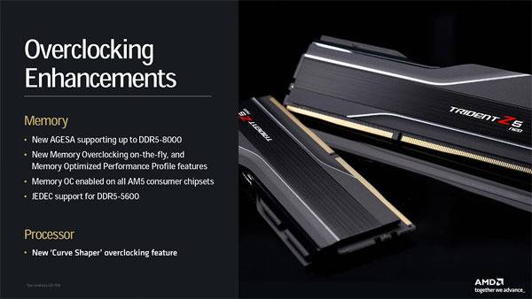 한편, 메모리 지원도 개선되었다. 공식 클럭이 DDR5 5200MHz서 DDR5 5600MHz로 상승하면서, AGESA 마이크로 코드서 최대 DDR5 8000MHz 메모리를 지원한다. 여기에 실시간 메모리 오버클럭 및 메모리 최적화 성능 프로파일 기능도 지원한다.