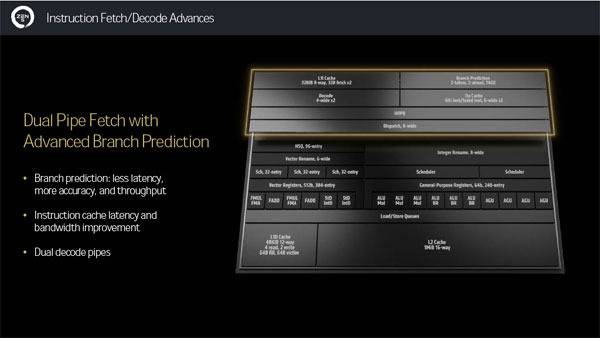 프론트엔드는 향상된 분기 예측과 듀얼 파이프 페치 구조로, 정확성을 높이고 레이턴시 감소, 이를 통해 더 많은 분기 예측을 실행하며, 명령어 캐시 레이턴시 및 대역폭 확대, 이중 디코드 파이프 추가가 이뤄졌다.