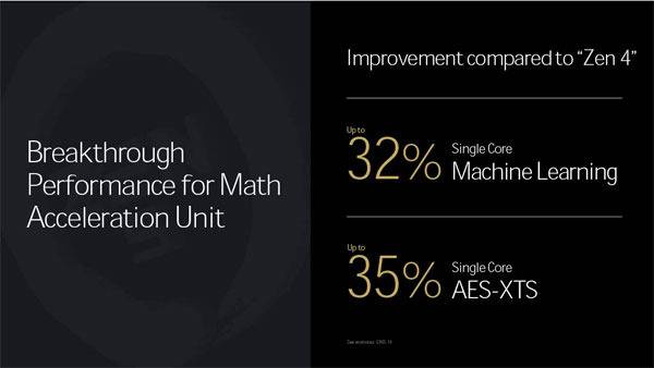결과적으로 Zen5 아키텍처는 Zen4 아키텍처 대비 평균 16%의 IPC 상향을 끌어내면서, 싱글 코어 기준, AI 시대에 높은 관심을 받고 있는 머신 러닝 성능은 최대 32%, 고급 암호화 기술인 AES-XTS 성능은 최대 35% 증가했다.