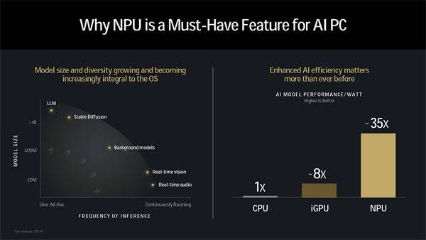 범용 프로세서인 CPU나 GPU에 비해 인공지능 관련 연산을 담당하는 NPU는 전력 효율이 최대 35배나 뛰어나다. 특히 MS에서 코파일럿+ PC라는 새로운 기준을 제시할 정도로 로컬 디바이스에서의 AI 기능도 중요시되고 있다.