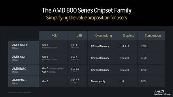 800 시리즈 칩셋은 컴퓨텍스에서 발표한 X870과 X870E에 더해 새로운 칩셋이 추가 발표되었다. B850과 B840이 그것으로, B650 칩셋을 대체하는 포지션이지만 B840은 PCIe 지원이 3.0 버전으로 제한되며, 오버클럭도 메모리만 가능해 A620 칩셋의 대체 포지션에 가까운 느낌이다.