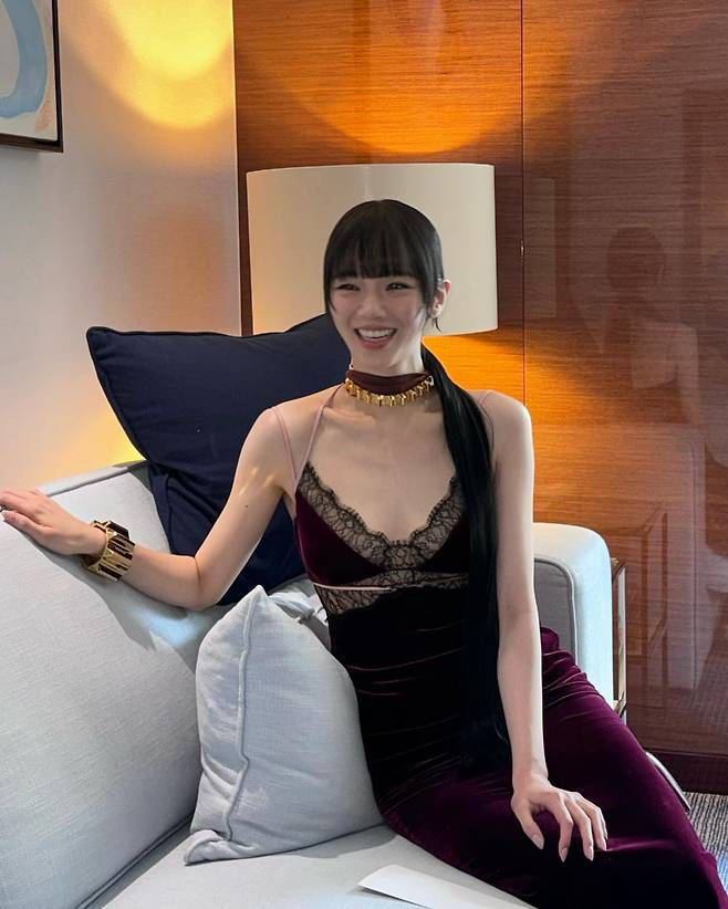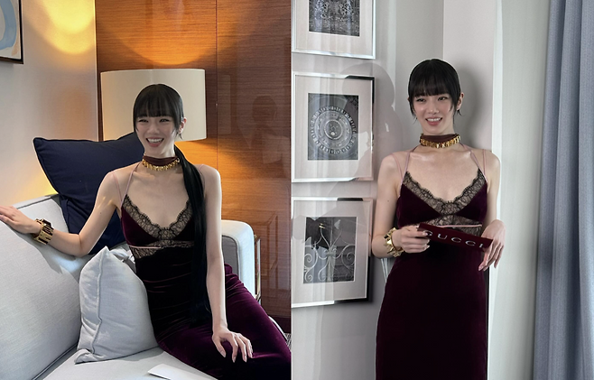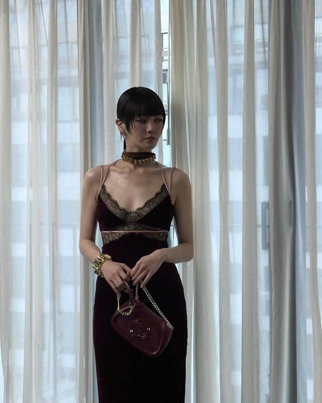 구찌 글로벌 브랜드 앰배서더 박규영은 포니테일 뱅헤어에 벨벳 소재의 버건디 드레스를 우아하게 소화했습니다.