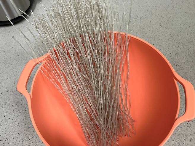 당면을 불릴 때 당면의 길이 때문에 그릇에 다 안 담기는 경우가 있습니다. 그러면 물에 닿는 부분만 불고 나머지 부분은 딱딱하게 되는데요. 오늘은 당면을 골고루 부드럽게 불리는 법 소개합니다.