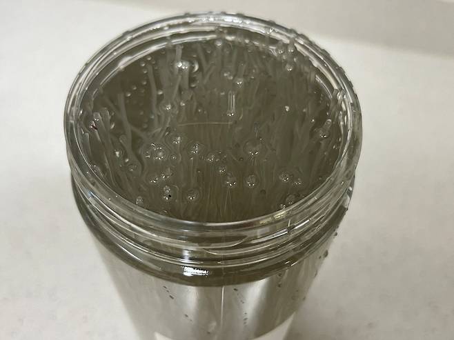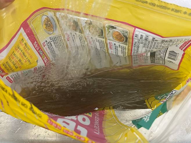 당면 봉지에 물이 새는 구멍이 없어야 합니다. 잘 확인하시고 물을 채우세요. 지퍼락을 꽉 잠가 당면을 충분히 불려 주세요.