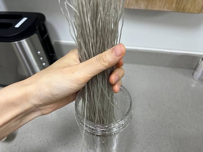 당면은 세워서 긴 통 안에 넣어 줍니다. 당면 길이와 얼추 높이가 비슷한 통을 사용해 주세요.