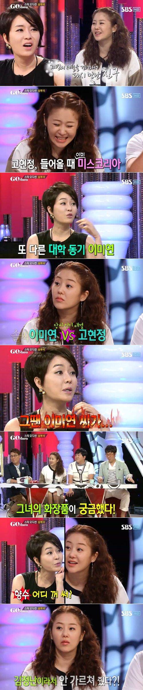 이어 "대학시절부터 도도했다. 얼굴빛도 정말 좋아서 무슨 화장품을 쓰는지 물어봤다. 그랬더니 고개만 끄덕이고 가더라. 어느날은 향수를 뭐쓰는지 물어봤는데 '어~'하면서 지나가더라"라고 일화를 전했다. 그러자 고현정은 "연기를 정말 잘해서 질투가 많았다"고 솔직히 답했다.