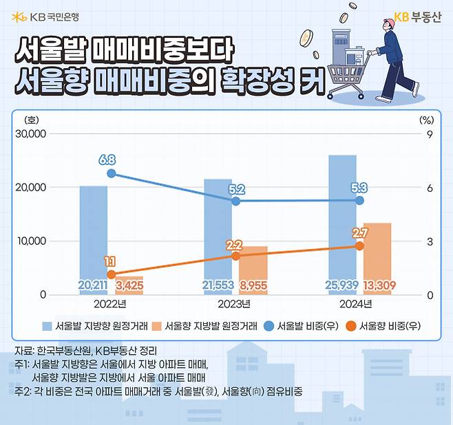 동기간 서울발 거래(서울→지방아파트 매매)는 7%, 20% 늘어났고, 서울향 거래(지방→서울아파트)는 161%, 49% 증가했습니다. 서울에 아파트를 매입한 지방거주자의 증가율이 현저히 큽니다. 전국 매매거래에서 서울발 거래비중은 2023~2024년 각각 5.2%, 5.3%로 횡보국면입니다. 반면 서울향 거래비중은 각각 2.2%, 2.7%로 비중 규모는 서울발보다 적지만 확장성이 큽니다.