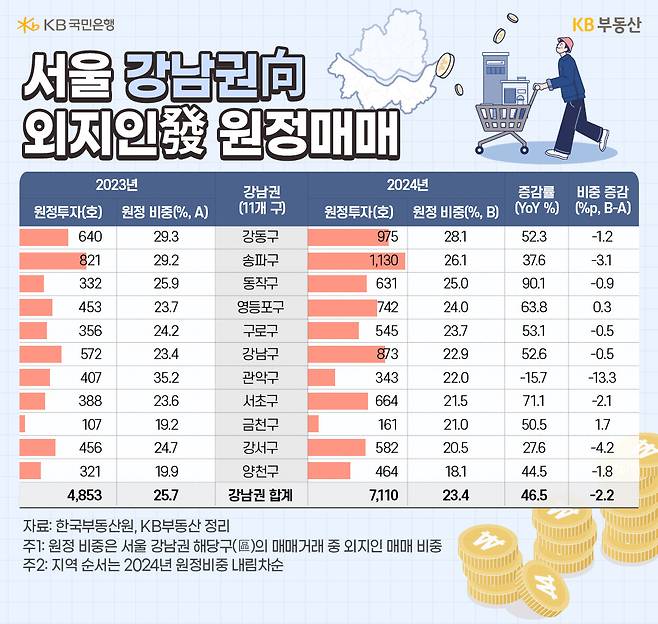2023~2024년 동안 서울 강남권 11개구(區) 아파트를 매입한 외지인 원정투자 비중을 살펴봤습니다. 외지인 원정비중을 Top5를 정렬하면 강동구 28.1%>송파구 26.1%>동작구 25.0%>영등포구 24.0%>구로구 23.7% 순입니다. 강남3구에서는 송파구가, 범(汎)강남권에서는 강동ㆍ동작구가 포함되어 있습니다. 개발이슈로 선호도가 급상승한 영등포구가 그 뒤를 이었습니다.