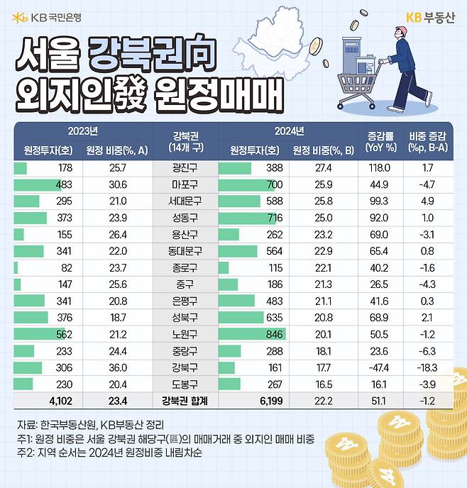2023~2024년 동안 서울 강북권 14개구(區) 아파트를 매입한 외지인 원정투자 비중을 살펴봤습니다. 연간 매매거래량 중 외지인 원정비중 높은 지역부터 내림차순으로 Top5를 정렬하면 광진구 27.4%>마포구 25.9%>서대문구 25.8%>성동구 25.0%>용산구 23.2% 순입니다. 강북권에서 최고 인기지역인 마용성이 모두 포함되어 있습니다.