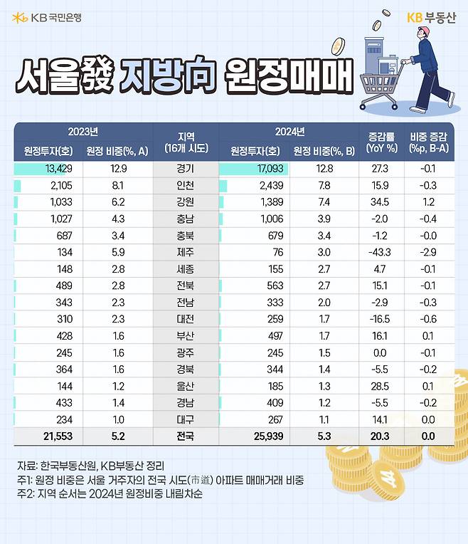 전반적인 원정거래 비중이 큰 변화가 없지만, 2024년 비중 상위지역 Top5를 살펴보면 경기 12.8%>인천 7.8%>강원 7.4%>충남 3.9%>충북 3.4% 순입니다. 수도권 집중도가 여전히 높고, 교통호재로 서울 접근성이 개선되는 강원에 대한 선호도가 높았습니다. 반면 충청권은 순위는 높지만 점유비중이 -0.0~-0.4%p 줄었고, 제주의 원정투자 감소율이 전국에서 가장 컸습니다.