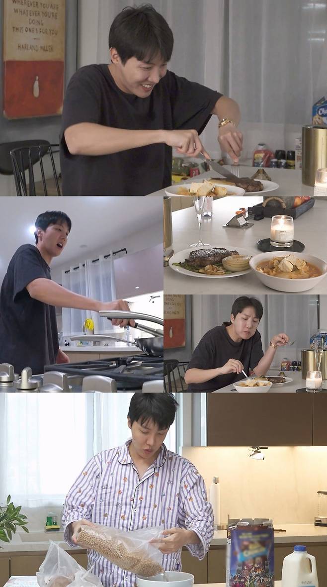 '나 혼자 산다'에서는 BTS의 제이홉(j-hope)이 직접 만든 L.A 스테이크와 고향의 맛을 담은 김치찌개로 저녁 만찬을 즐기는 가운데, 미모의 누나가 등장한다.