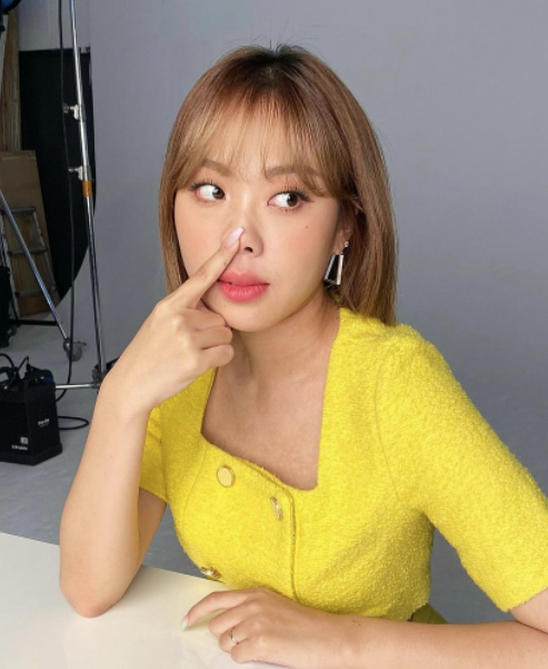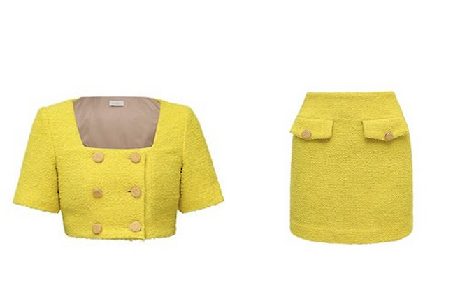 봄에 입으면 좋을 투피스룩입니다. 이영지는 옐로우 색상을 완벽하게 소화해냈습니다.스퀘어넥 크롭 스타일의 상의에 미니스커트로 발랄하고 상큼한 룩을 연출했습니다.