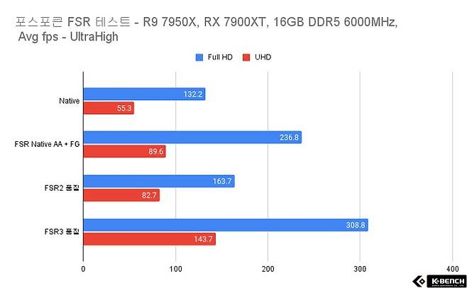 성능 결과를 살펴보면, 바로 이전에 가장 품질적으로 아쉬움을 자아냈던 업스케일링+프레임보간이 적용된 FSR3가 가장 높은 결과치를 보여준다.