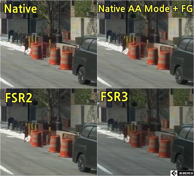 사실 FSR3 화면이 가장 아쉽다곤 하지만, 현재의 업스케일링 기술과 프레임 보간 기술이 접목되면 이러한 크롭화면에서의 디테일은 확실히 떨어질 수 밖에 없는 것이 사실이다.