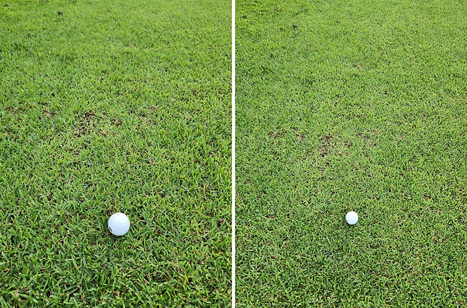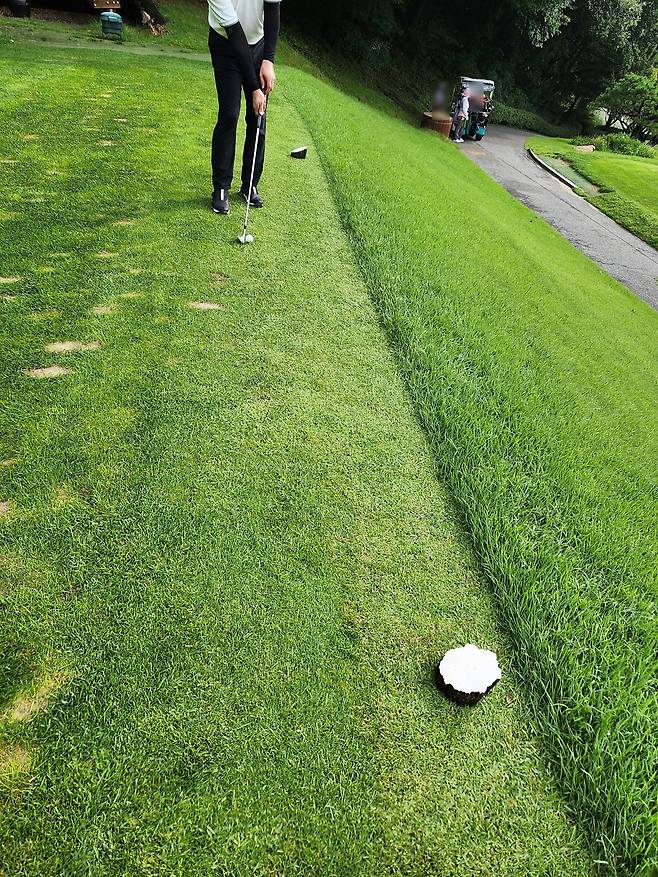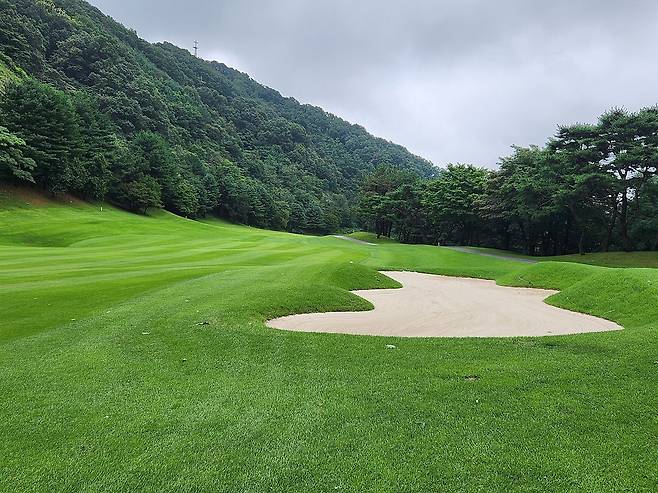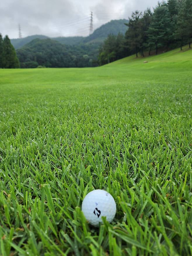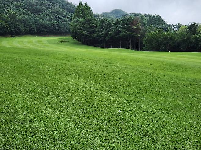 중지 페어웨이와 러프이며 둘 다 잔디가 촘촘하게 관리되었습니다. 또한, 잔디는 질긴 편이고 디봇은 너덜너덜하게 부스러집니다. 페어웨이는 넓은 편이며 산을 깎아서 만든 코스라서 한쪽은 주로 내리막 슬로프로 공이 내려옵니다. 러프 구역도 크진 않습니다만 잔디는 페어웨이와 차이 나게 관리되었습니다. 공이 깊게 내려앉지는 않지만 질긴 러프라서 신경 써야 합니다.