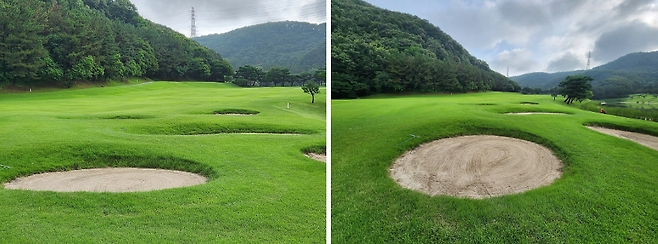 투-그린 시스템 골프장은 주로 그린 사이드 벙커들이 그리 크거나 어렵지 않습니다. 신원 CC 역시 그린 사이드 벙커는 각 그린마다 하나씩만 있는 게 자주 보였습니다. 벙커 턱은 적당한 높이지만 가끔 깊다고 느껴지기도 합니다. 우측 그린에 딸린 벙커들이 약간 더 어려워 보이는 것으로 봐서 우측 그린 플레이가 더 어려울 것 같습니다. 모래는 부드럽지만 약간 무겁습니다. 페어웨이 벙커들도 홀마다 한두 개만 있는듯하며 난이도와 전방 턱은 높지 않았습니다.