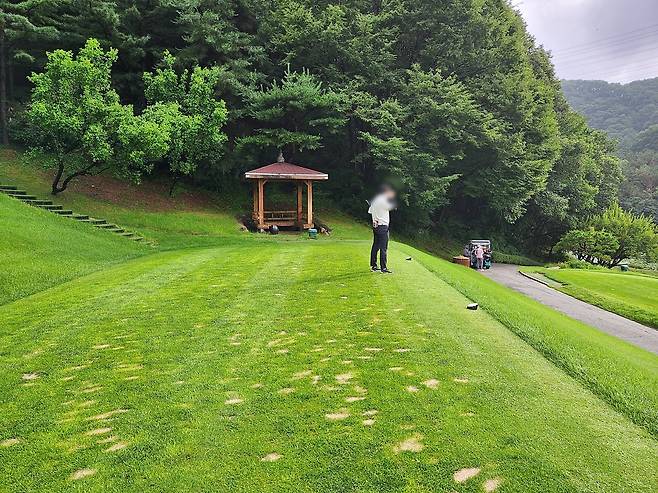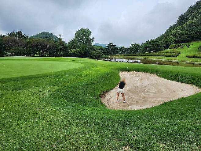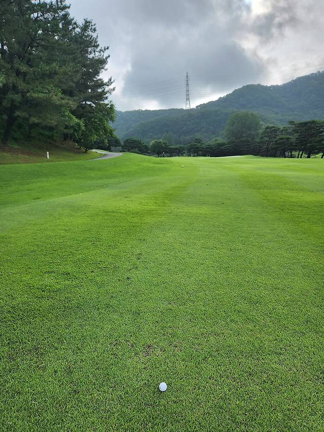 중지 페어웨이와 러프이며 둘 다 잔디가 촘촘하게 관리되었습니다. 또한, 잔디는 질긴 편이고 디봇은 너덜너덜하게 부스러집니다. 페어웨이는 넓은 편이며 산을 깎아서 만든 코스라서 한쪽은 주로 내리막 슬로프로 공이 내려옵니다. 러프 구역도 크진 않습니다만 잔디는 페어웨이와 차이 나게 관리되었습니다. 공이 깊게 내려앉지는 않지만 질긴 러프라서 신경 써야 합니다.
