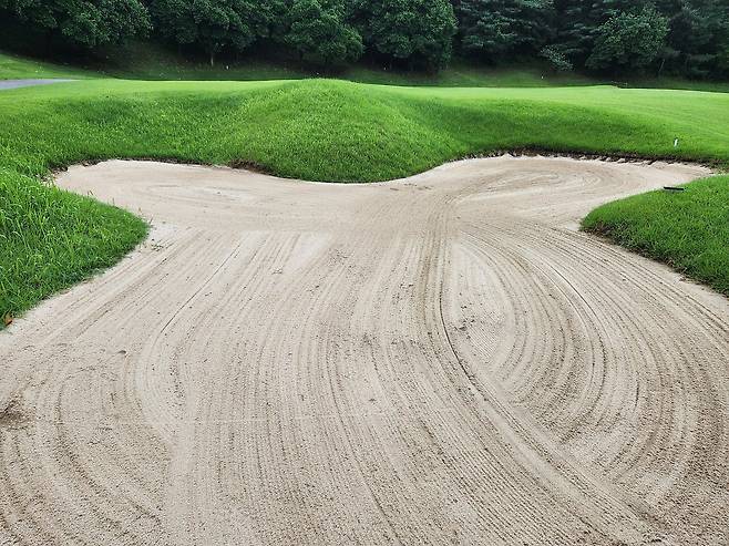 투-그린 시스템 골프장은 주로 그린 사이드 벙커들이 그리 크거나 어렵지 않습니다. 신원 CC 역시 그린 사이드 벙커는 각 그린마다 하나씩만 있는 게 자주 보였습니다. 벙커 턱은 적당한 높이지만 가끔 깊다고 느껴지기도 합니다. 우측 그린에 딸린 벙커들이 약간 더 어려워 보이는 것으로 봐서 우측 그린 플레이가 더 어려울 것 같습니다. 모래는 부드럽지만 약간 무겁습니다. 페어웨이 벙커들도 홀마다 한두 개만 있는듯하며 난이도와 전방 턱은 높지 않았습니다.