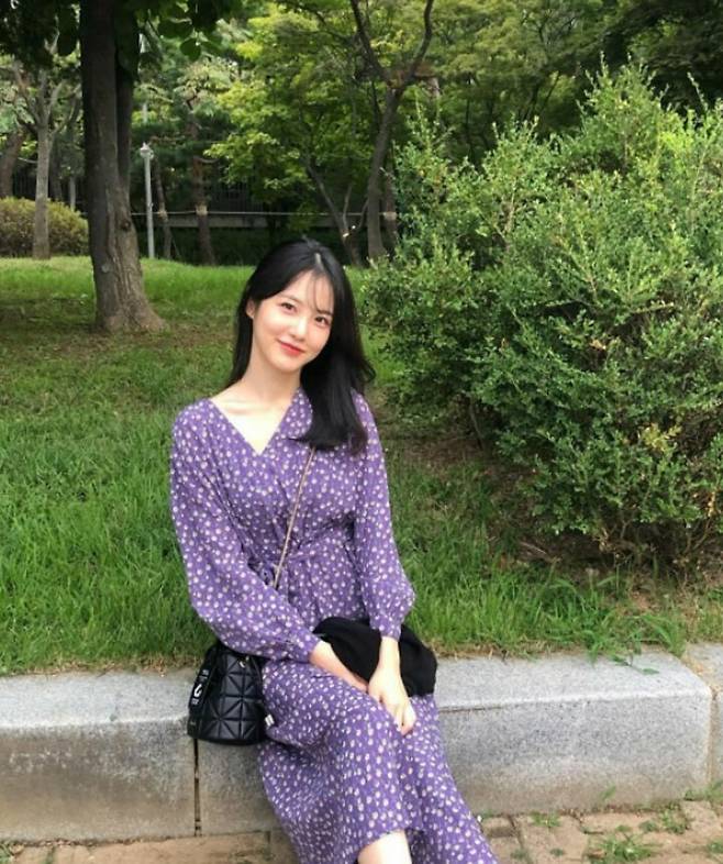 공개된 사진 속 신예은은 긴 생머리에 보라색 땡땡이 원피스를 입어 청순하고 풋풋한 모습을 발산하고 있다.