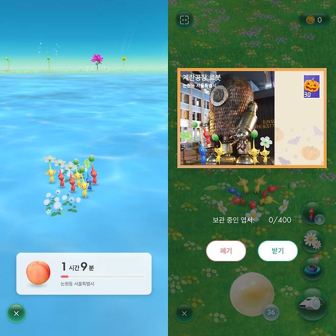 개인적으로 가장 재미있었던 건 탐험 기능이었다. 모종과 정수를 얻기 위해 탐험을 떠난 피크민이 돌아오기까지는 꽤 오랜 시간을 기다려야 한다. 실제 위치 정보를 기반으로 하기 때문에 강남구에서 중랑구까지 탐험을 보내려면 3~4시간이 넘게 소요되기도 한다. 탐험에서 돌아온 피크민은 아이템과 함께 종종 엽서를 가져온다. 엽서에는 탐험을 나갔다가 수집한 실제 거리 사진이 붙어 있다. 강남 어딘가의 조각상 사진, 청담동 아파트단지의 놀이터 사진 등 다양한 엽서를 수집하는 재미가 쏠쏠하다.