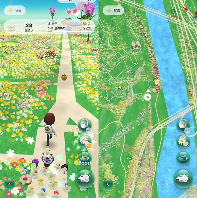 그렇다면, 수많은 플레이어를 사로잡은 피크민 블룸의 매력은 뭘까. 직접 플레이 해본 결과, 그 답은 ‘단순함’이었다. 일반적으로 게임을 진행하려면 캐릭터 진화를 위해 능력치를 자세히 알고 있거나 각종 배틀에 참여해야 하지만, 피크민 블룸은 산책을 제외하곤 플레이에 대한 부담이 거의 없다. 애써 시간을 투자하거나 캐릭터를 이리저리 움직여 조작할 필요도 없어 피로도가 매우 낮다. 먼 곳에 있는 모종이나 정수를 구할 때도 피크민들을 보내 놓고 기다리기만 하면 되고, 게임에 자주 접속하지 않아도 걸음 수를 카운팅해 자동으로 꽃을 심고 모종 새싹을 틔워 준다. 가만히 놔둬도 알아서 잘 크는 방치형 게임과 비슷하다.