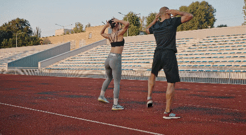 바닥에 서서 다리를 어깨너비로 벌립니다. 양손은 머리 옆으로 가져갑니다. 왼쪽 무릎을 공중으로 당기며 몸을 비틀어 오른쪽 팔꿈치가 왼쪽 무릎에 닿도록 합니다. 반대쪽도 마찬가지로, 오른쪽 무릎을 당기며 왼쪽 팔꿈치를 가져갑니다.