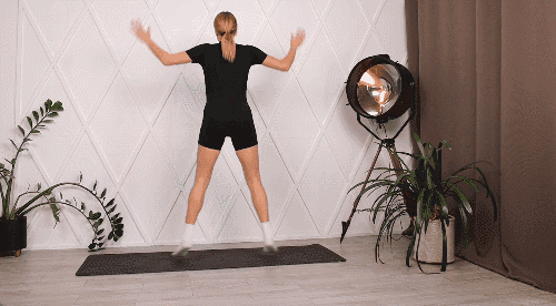 발을 모으고 서서 양팔을 몸 옆에 붙입니다. 점프하면서 다리를 넓게 벌리고 동시에 팔을 머리 위로 올립니다. 다시 점프하여 다리를 모으고 팔을 원래 위치로 내립니다. 이 동작을 연속적으로 빠르게 반복합니다.