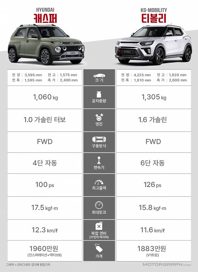 KG모빌리티가 지난 1일 소형 SUV 티볼리 페이스리프트를 선보였다. 1883만원부터 시작하는 저렴한 가격으로 출시해 경쟁력을 높였다는 평가다. 그러나 낮아진 가격 만큼 빠진 옵션이 너무 많다는 의견도 있다. 일부 소비자들은 "차가 좀 작더라도 차라리 사양이 좋은 캐스퍼를 사는게 낫겠다"는 주장을 하기도 했다. 과연 1900만원짜리 티볼리와 캐스퍼는 어떤 차이가 있을까. 모터그래프가 직접 비교해 봤다.